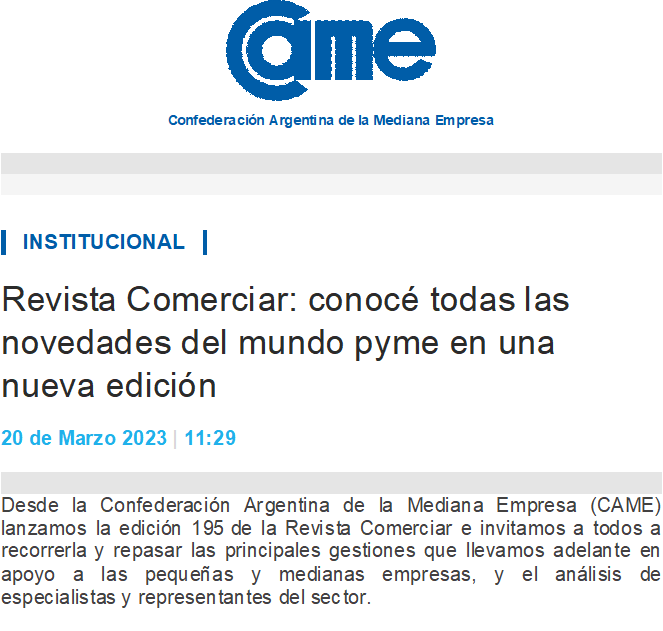 Confederación Argentina de la Mediana Empresa INSTITUCIONAL Revista Comerciar: conocé todas las novedades del mundo pyme en una nueva edición 20 de Marzo 2023 | 11:29 Desde la Confederación Argentina de la Mediana Empresa (CAME) lanzamos la edición 195 de la Revista Comerciar e invitamos a todos a recorrerla y repasar las principales gestiones que llevamos adelante en apoyo a las pequeñas y medianas empresas, y el análisis de especialistas y representantes del sector. En esta especial edición, que reúne la actividad desarrollada durante los meses de enero y febrero, encontrarán el detalle de los encuentros federales organizados por CAME en las ciudades de Buenos Aires y Resistencia, Chaco, así como las acciones de gestión realizadas en favor del sector pyme, los informes producidos por CAME, y la opinión de especialistas sobre la situación de los diversos rubros productivos. Para acceder a la edición 195 de la Revista Comerciar, clic aquí. Compartir Confederación Argentina de la Mediana Empresa. Más de seis décadas de compromiso con las PYMES. Leandro N. Alem 452 (C1003AAR), CABA - Argentina. Tel.: (011) 5556-5556